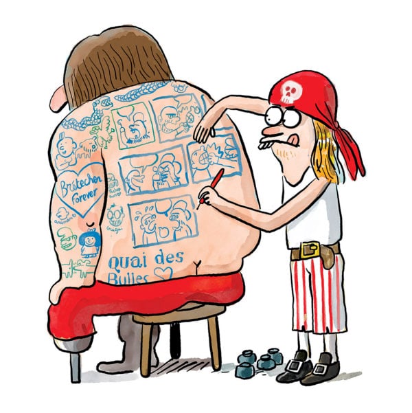 L’affiche de “Quai des Bulles” - Un petit pirate tatoue des cases de BD sur le dos d’un gros pirate