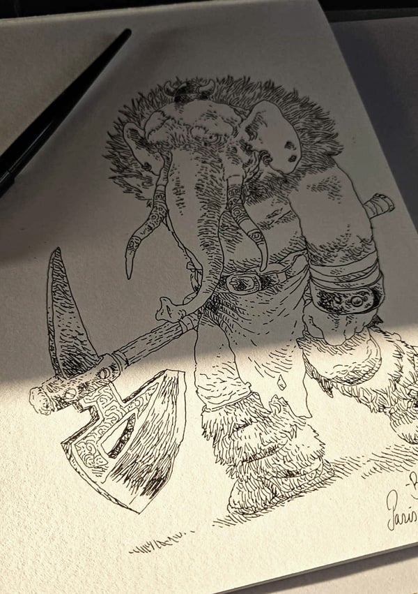 Un éléphant-guerrier anthropomorphe, habillé de fourrures et tenant une gigantesque hache de combat à la main.
